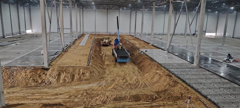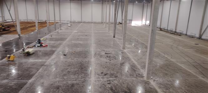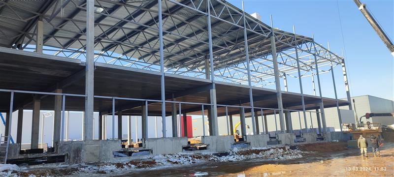 Устройство фундаментов, цоколя, доклевеллеров обоих блоков. Монтаж ж/б колонн, металлоконструкций, кровли, балок и плит перекрытий антресоли, монтаж стеновых сэндвич панелей, устройство песчаного основания и промышленных полов в Блоке №1. Монтаж технических и бытовых помещений внутри, отделочные работы.