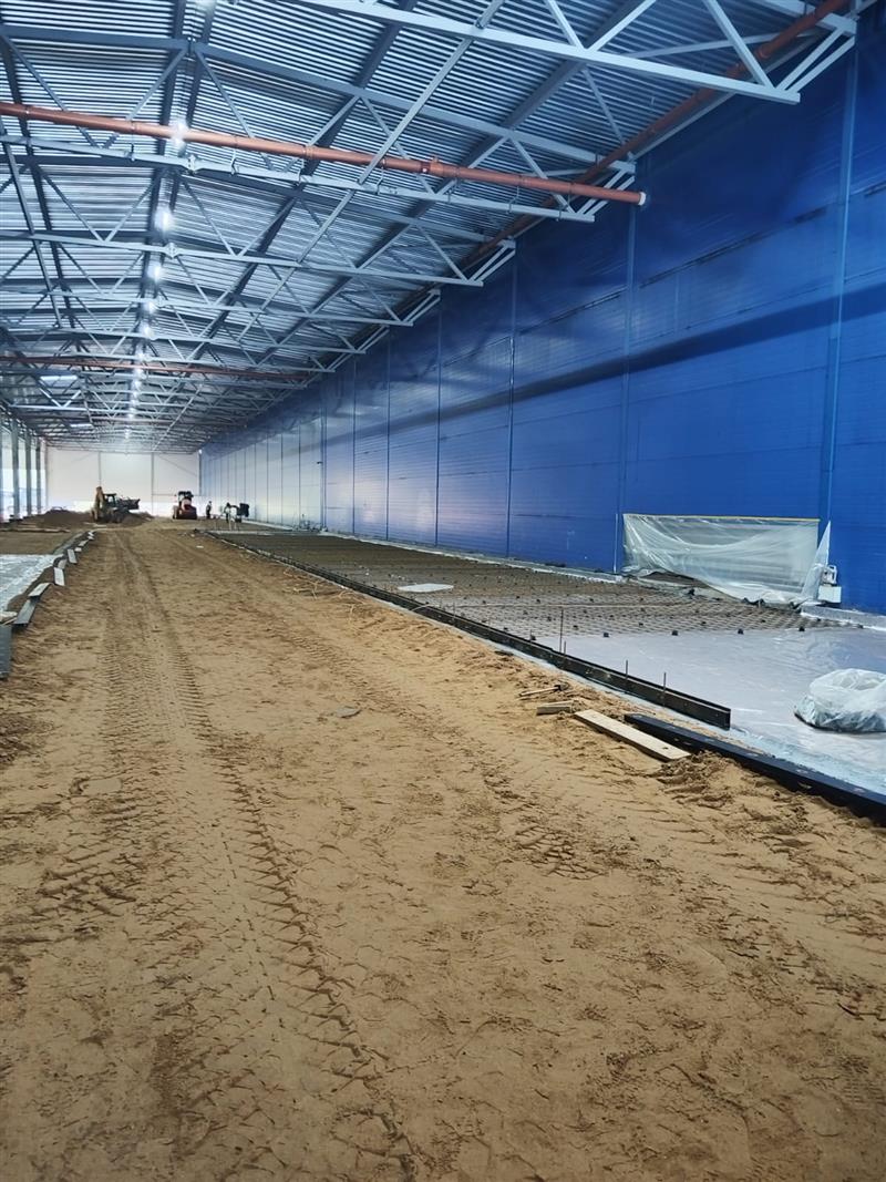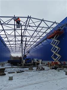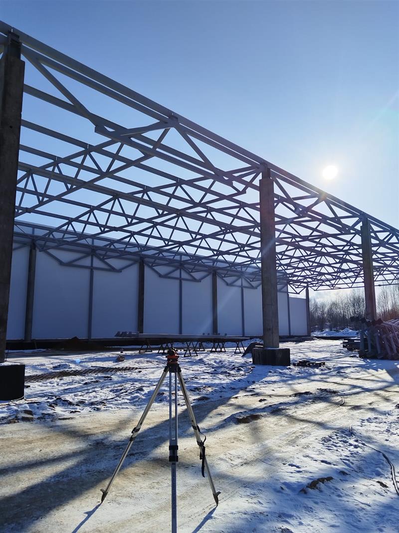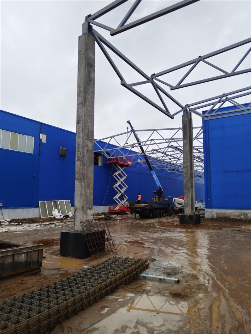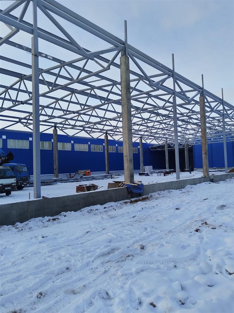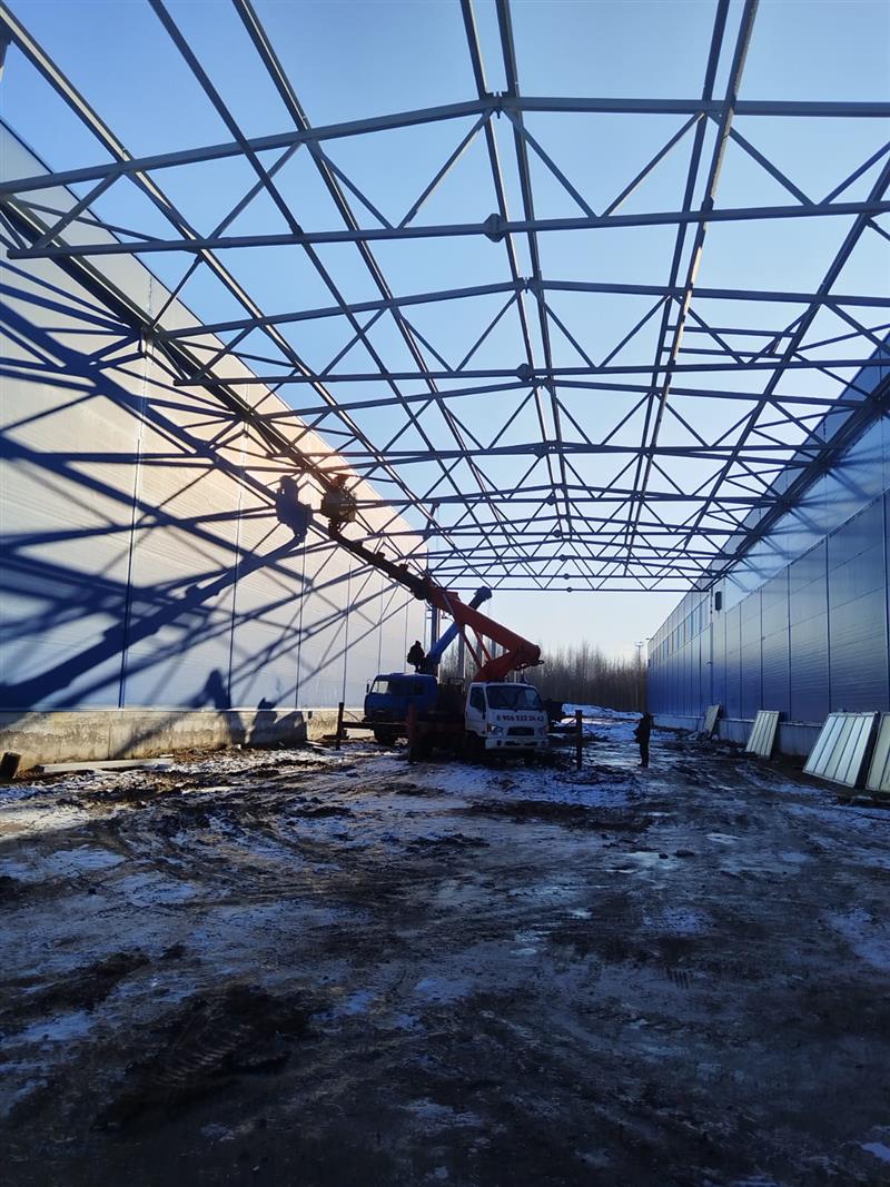 Монтаж металлоконструкций, кровли, стен сэндвич панелями, устройство песчаного основания и промышленных полов, дверных и воротных проемов.